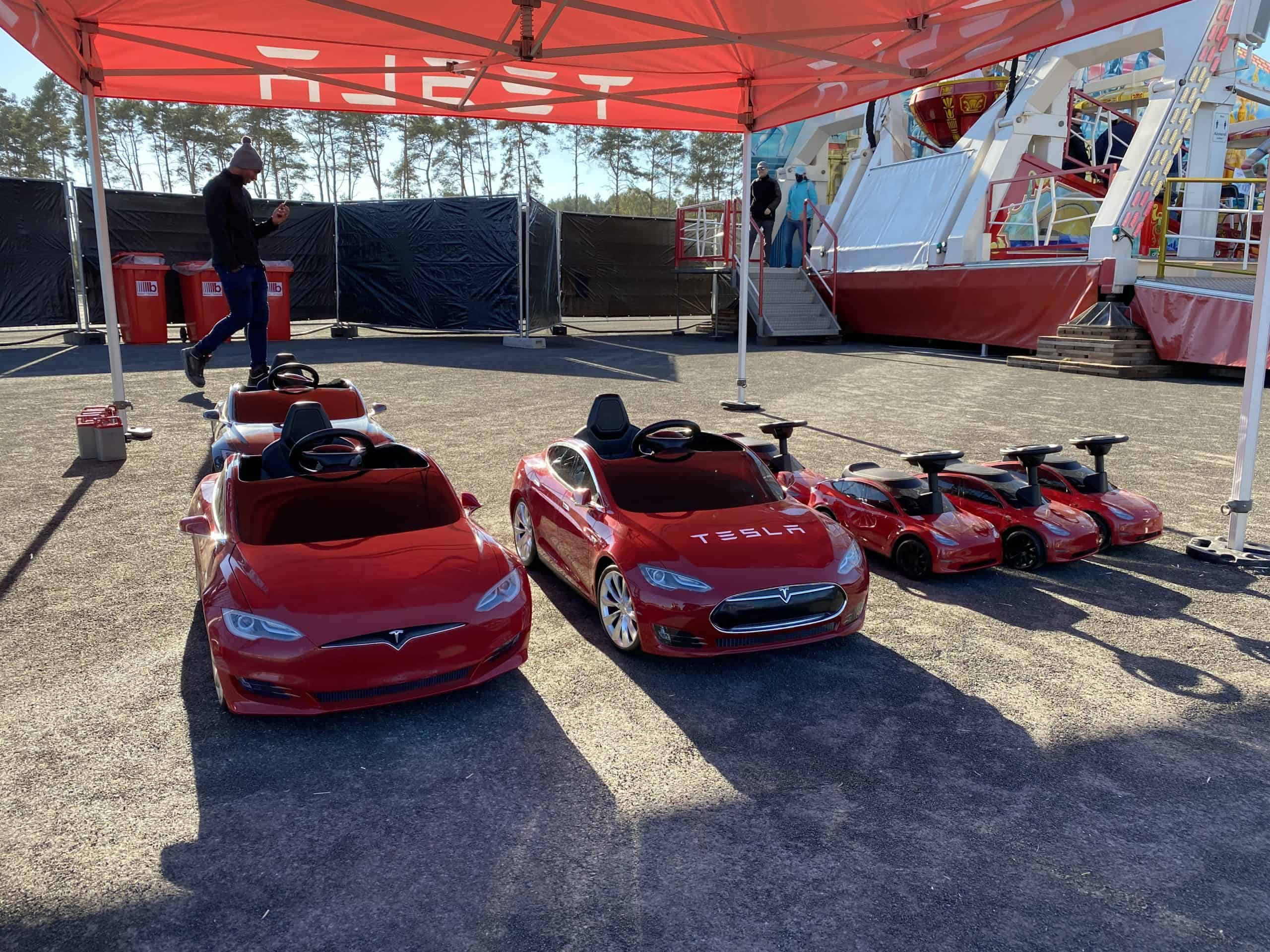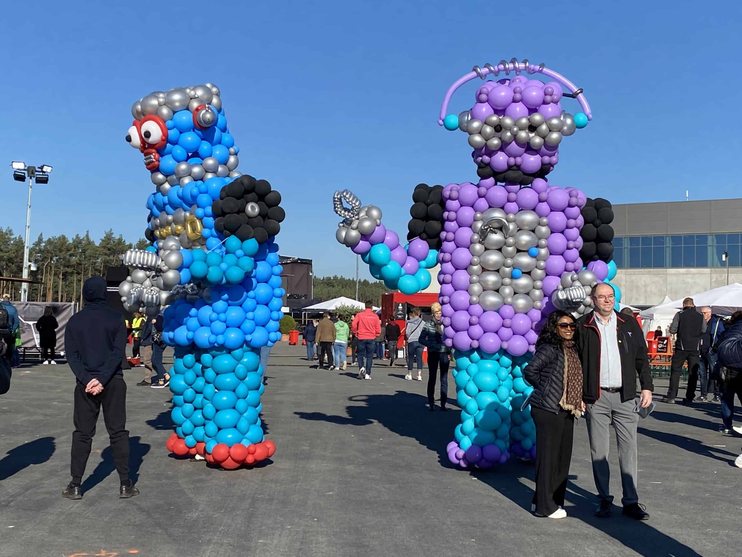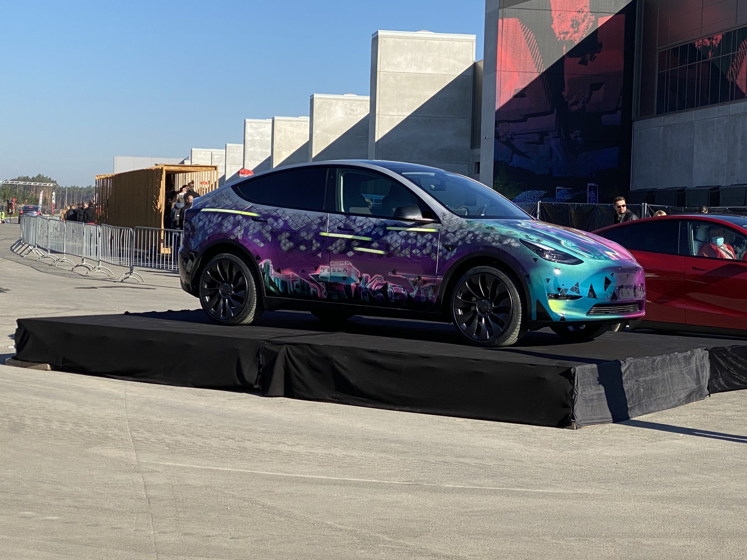 We kwamen aan op het terrein onder een stralende zon, die de hele dag van de partij bleef. We werden verwelkomd door grote robots en op het terrein was er een reuzenrad, botsauto’s, een draaimolen, een lunapark en tientallen kraampjes om wat te eten en drinken. Naast de aanduidingen voor de factory tour, konden we een stoplichtsprintje doen met de Model Y. Er stond daar ook een zeer kleurrijke Model Y tentoongesteld, dat was het eerste prototype van de model Y dat in de fabriek is gebouwd.