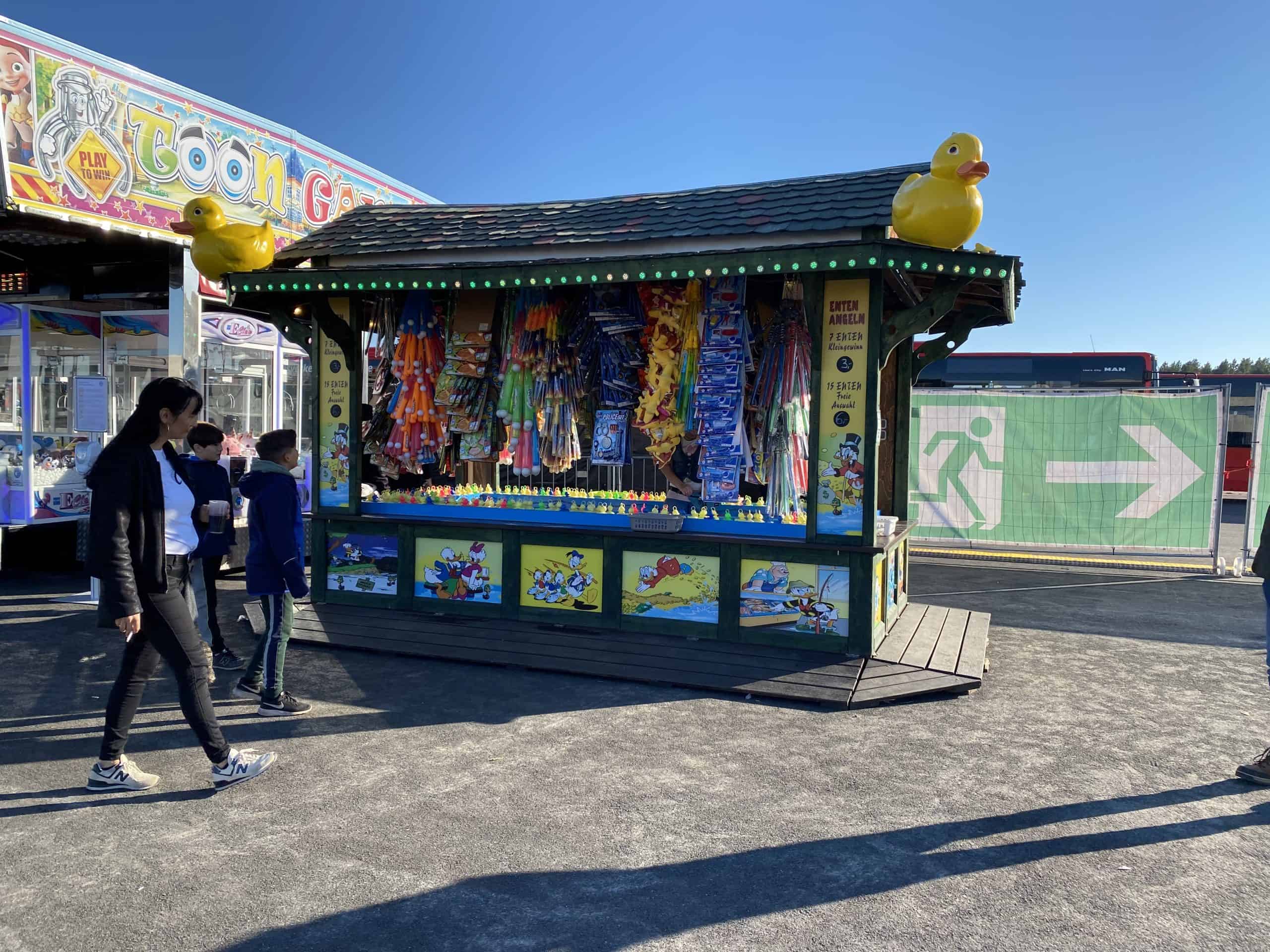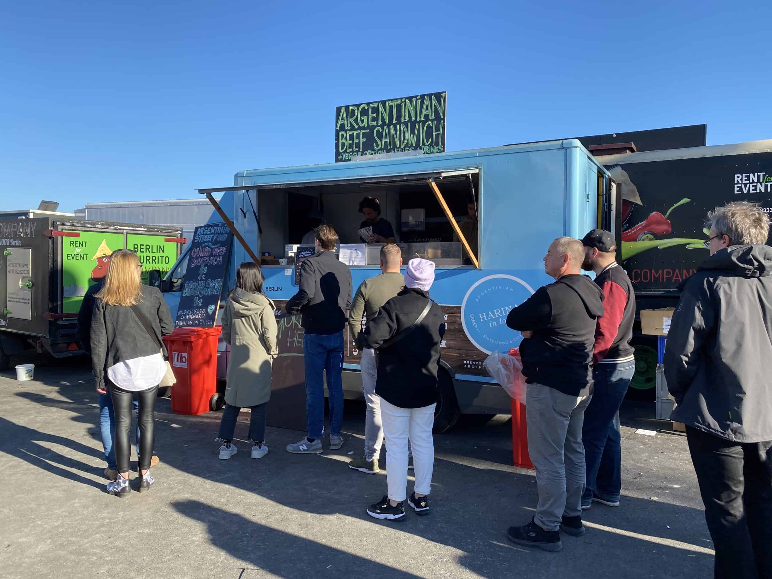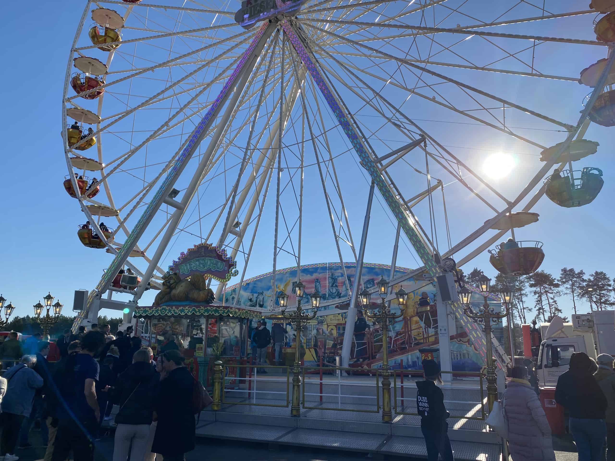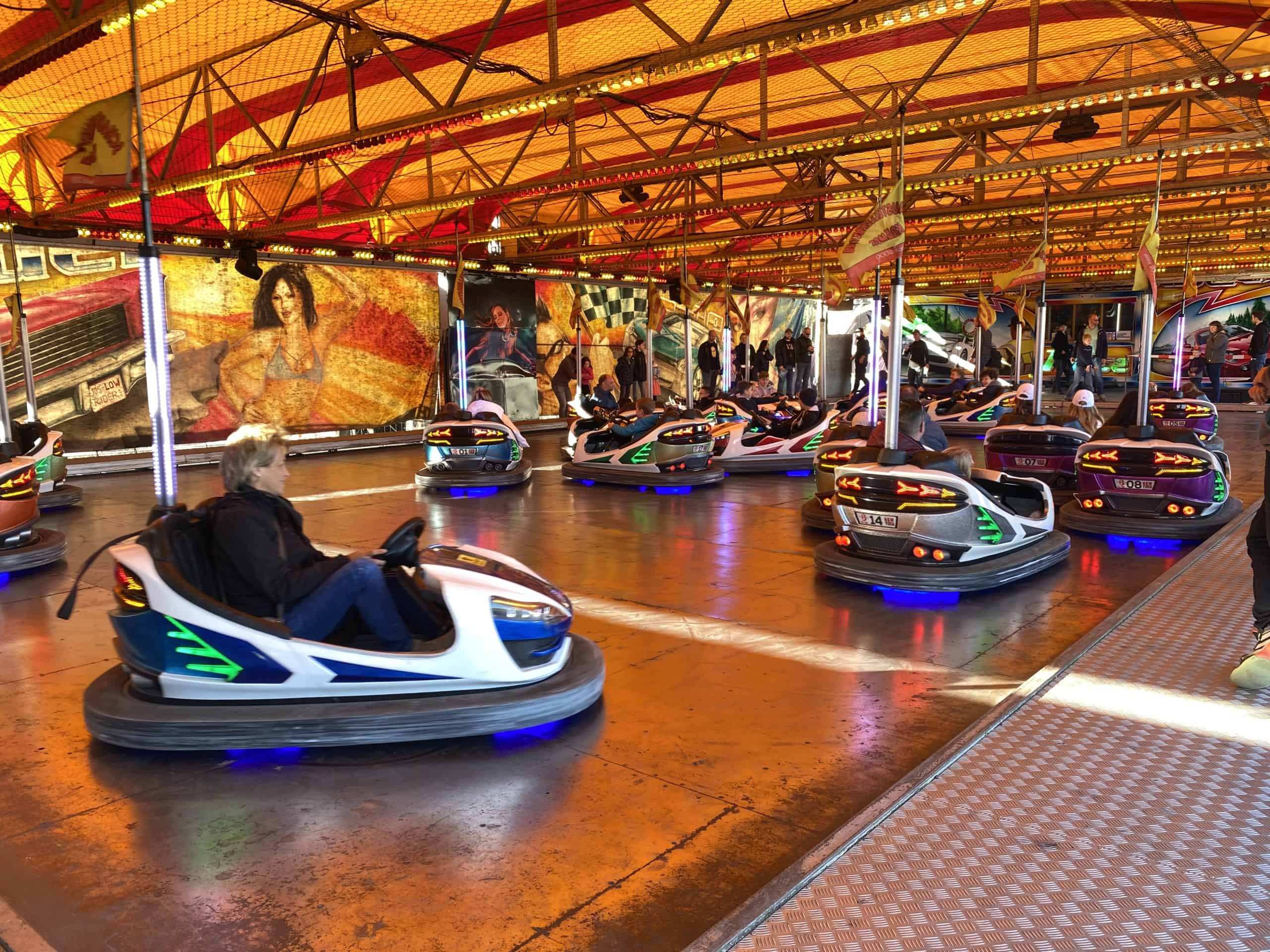 We kwamen aan op het terrein onder een stralende zon, die de hele dag van de partij bleef. We werden verwelkomd door grote robots en op het terrein was er een reuzenrad, botsauto’s, een draaimolen, een lunapark en tientallen kraampjes om wat te eten en drinken. Naast de aanduidingen voor de factory tour, konden we een stoplichtsprintje doen met de Model Y. Er stond daar ook een zeer kleurrijke Model Y tentoongesteld, dat was het eerste prototype van de model Y dat in de fabriek is gebouwd.