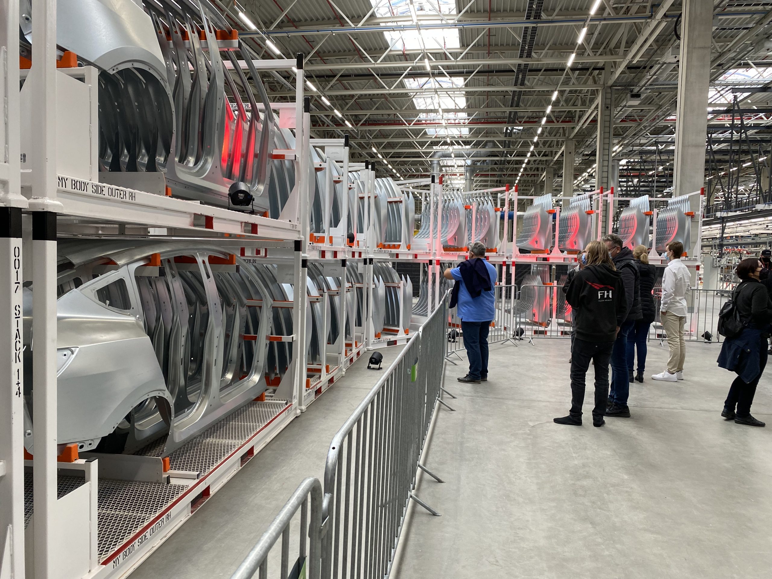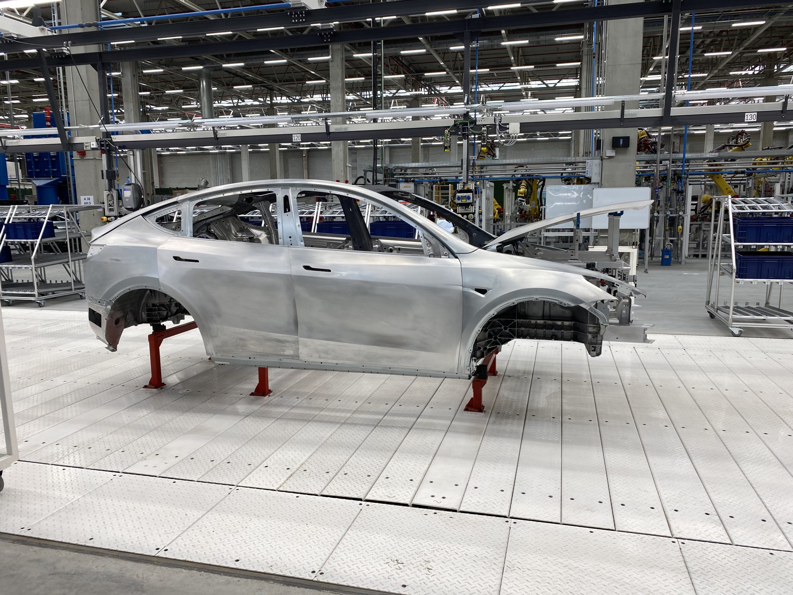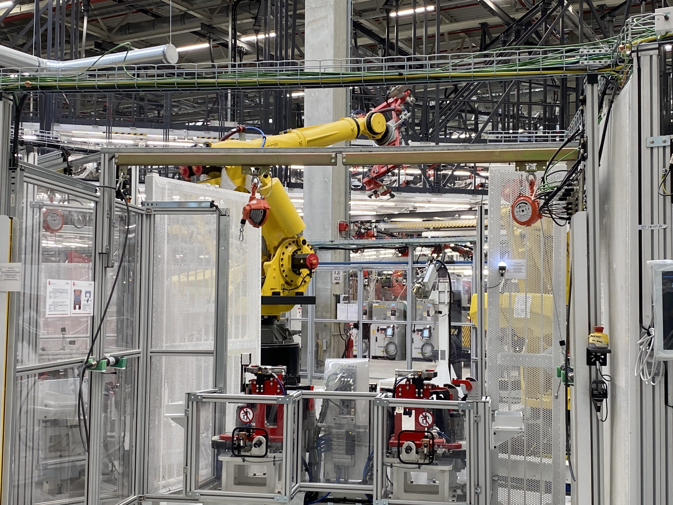 Vervolgens kwamen we opnieuw langs een hele reeks robots die op één lijn stonden en dat was waar alle apart geperste onderdelen werden samengesteld tot de carrosserie van de model Y, want dat is het model dat ze hier in eerste instantie gaan bouwen. Om je een idee te geven, het betreft hier 445 robots op een oppervlak van 32.000 m2, dat is ongeveer 5 voetbalvelden, waarbij op deze lijn 950 personen te werk worden gesteld.