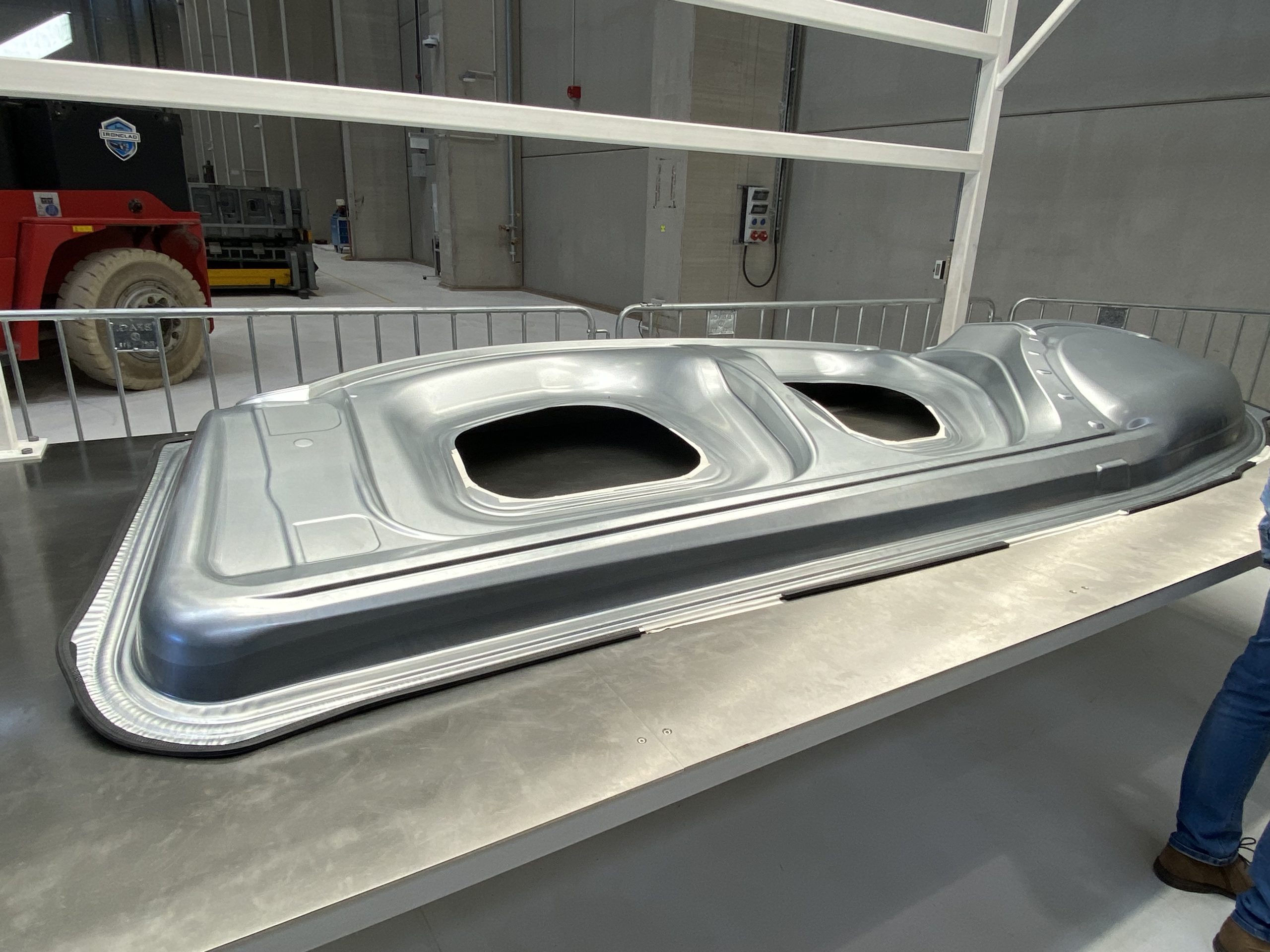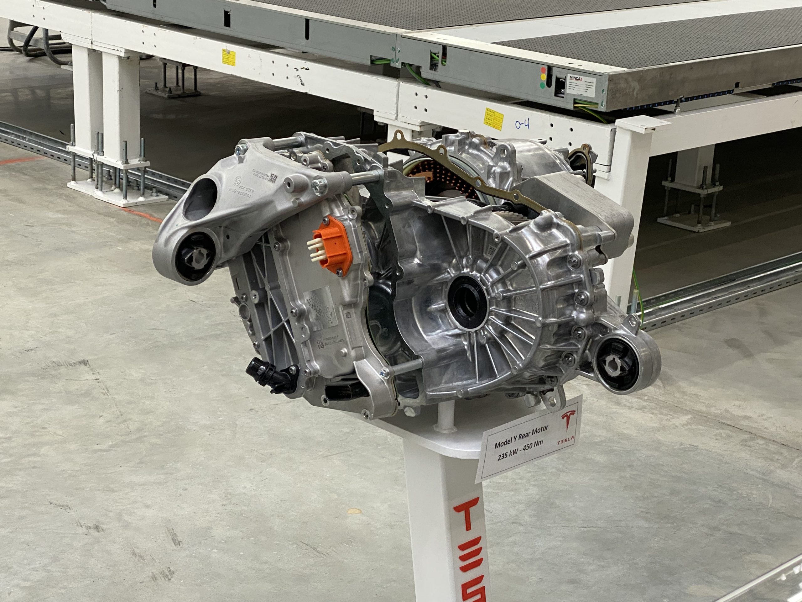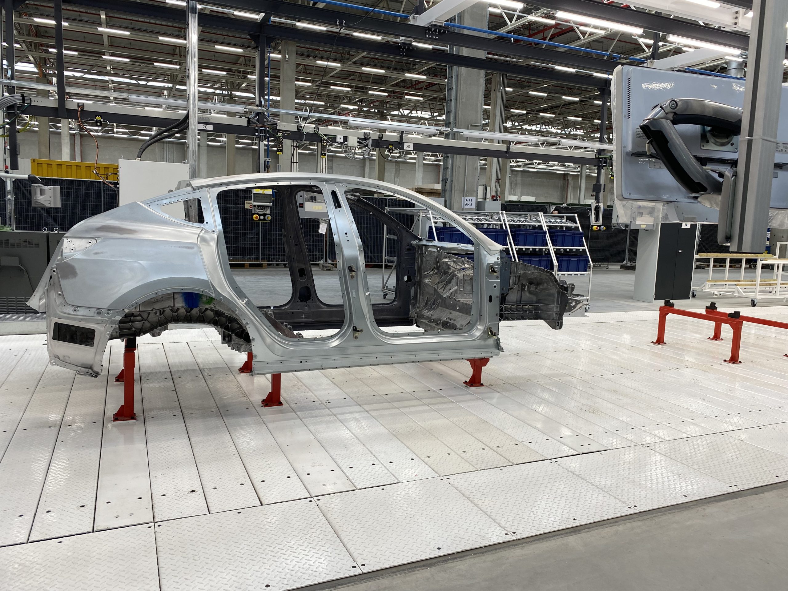 Vervolgens kwamen we opnieuw langs een hele reeks robots die op één lijn stonden en dat was waar alle apart geperste onderdelen werden samengesteld tot de carrosserie van de model Y, want dat is het model dat ze hier in eerste instantie gaan bouwen. Om je een idee te geven, het betreft hier 445 robots op een oppervlak van 32.000 m2, dat is ongeveer 5 voetbalvelden, waarbij op deze lijn 950 personen te werk worden gesteld.