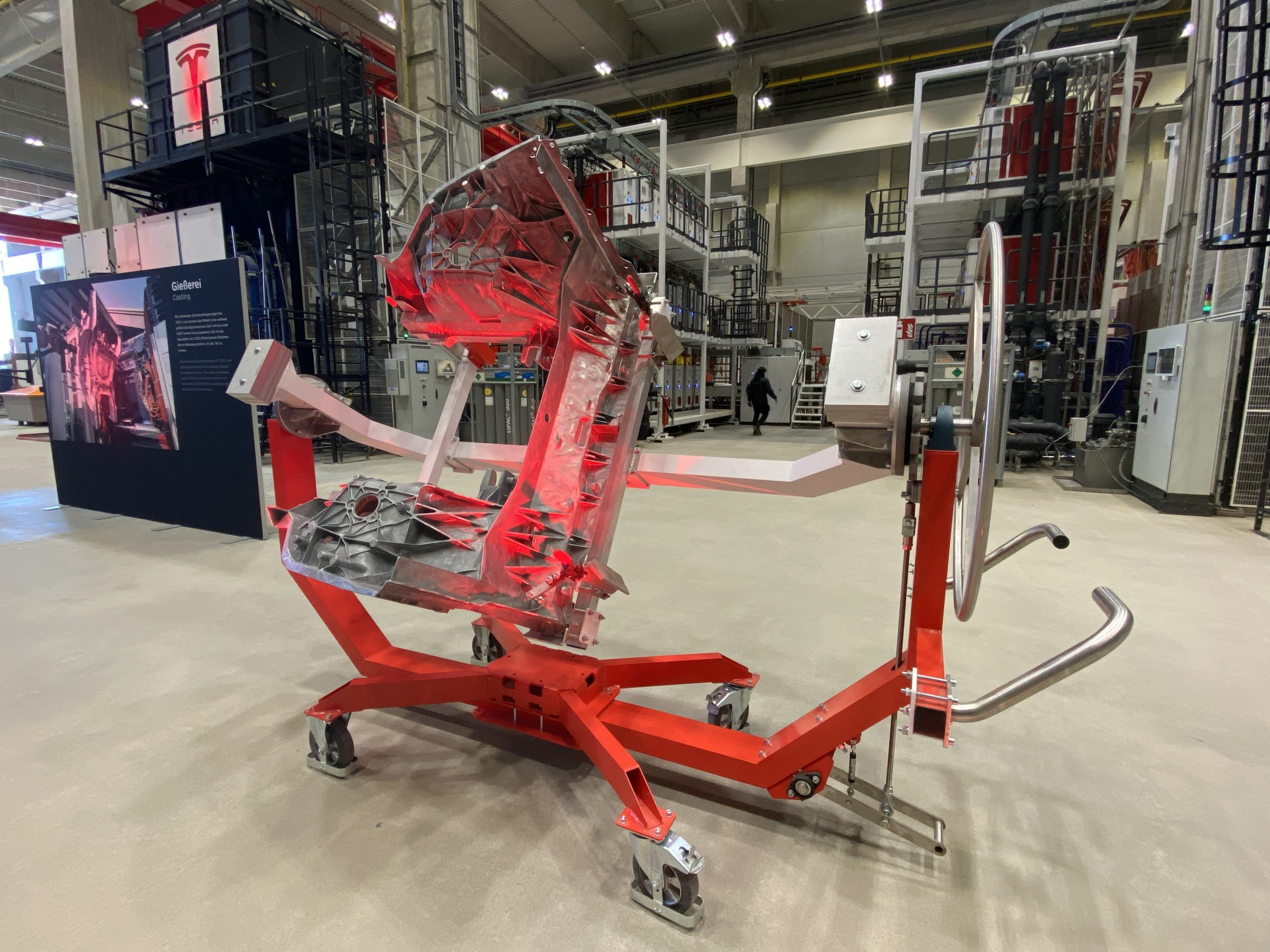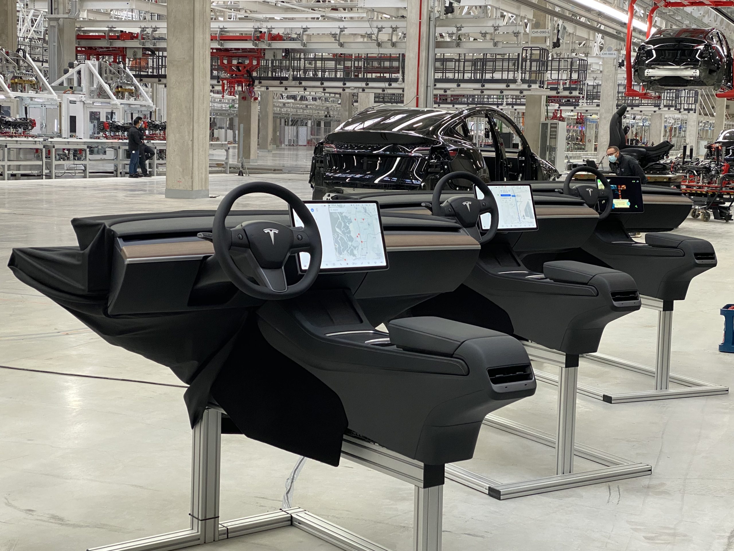 De volgende stap die we te zien kregen was de montage van de Model Y. Via 289 werkstations die bemand worden door 5.000 werknemers worden alle onderdelen samengebracht tot het een echte auto wordt. Per productielijn, die ongeveer 12 voetbalvelden groot is, kunnen op jaarbasis 500.000 auto’s worden samengesteld. In dit deel van het traject was er veel minder te zien, hoofdzakelijk omdat hier heel wat arbeidskracht vereist is om alles te laten draaien, en die zijn er natuurlijk nog niet.We kregen wel nog heel wat informatie over de verschillende onderdelen die tijdens deze fase worden gemonteerd en ook gemaakt worden in de fabriek. Wisten jullie bijvoorbeeld dat Tesla de bank en stoelen in de Model Y ook zelf produceert? Zo was er ook een volledige productielijn van de stoelen en banken te zien.