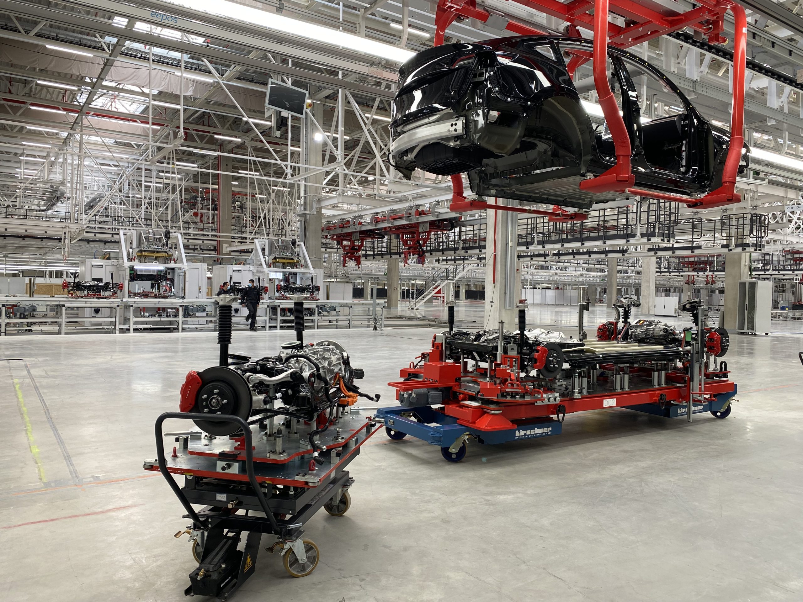 Nadat de carrosserie is samengesteld is het tijd voor de lakstraat, waar elke carrosserie één van de 7 lakkleuren over zich heen krijgt. Je leest het goed, 7 kleuren, terwijl Tesla er momenteel maar 5 aanbiedt. Welke die 2 extra kleuren zijn, hebben we niet gezien, maar een terugkeer van het zilvergrijs en een nieuw soort bordeaux lijken wel kanshebbers. Hoe het precies in de lakstraat eraan toe gaat hebben we niet kunnen zien maar een video bracht dat wel mooi in beeld. De stappen die worden doorlopen zijn: ontvetten, coaten en lakken. De lakstraat is bijna 3 maal groter dan de lijn waarop de carrosserie werd gemonteerd en stelt 750 mensen en 120 robots te werk.