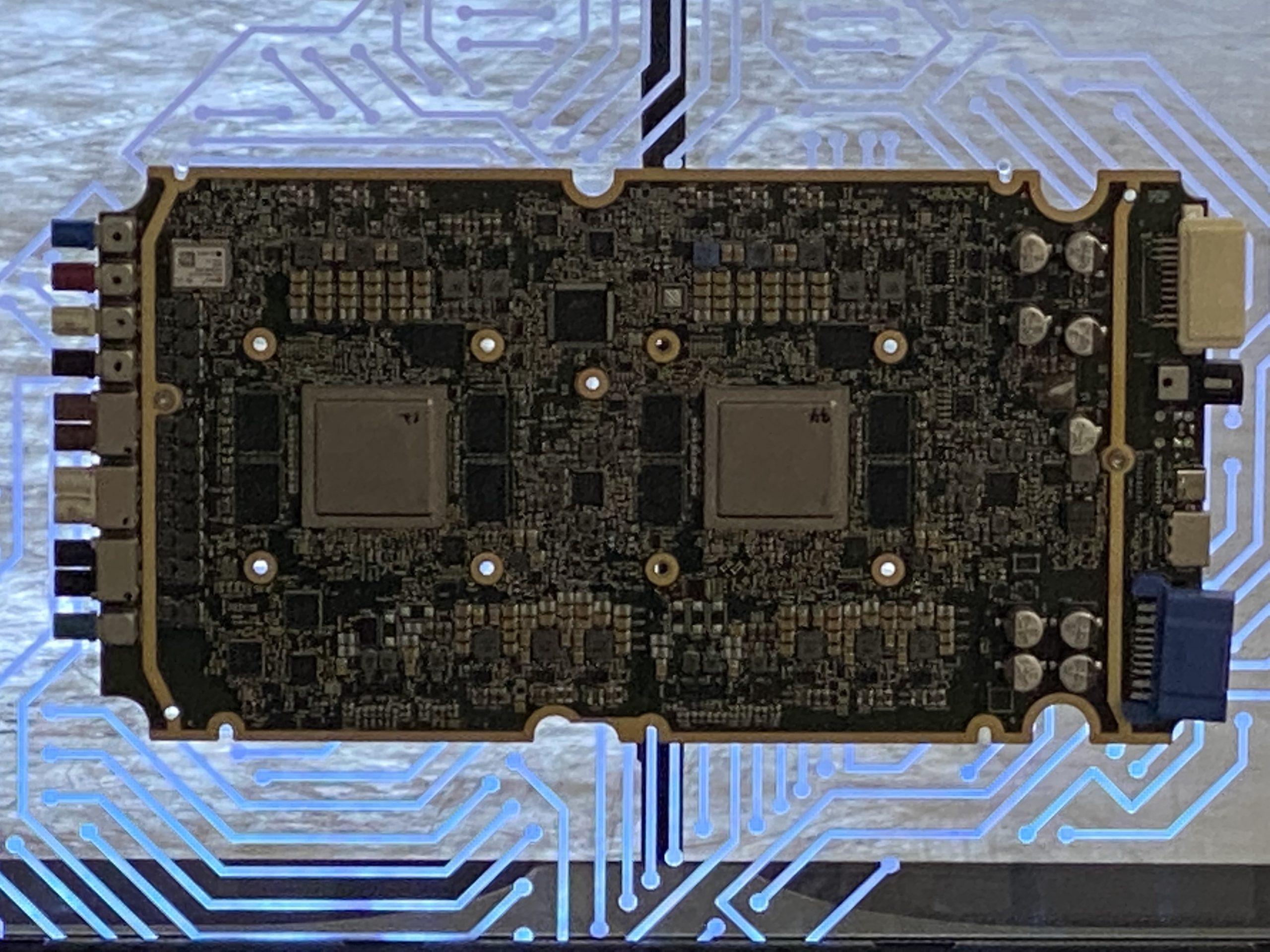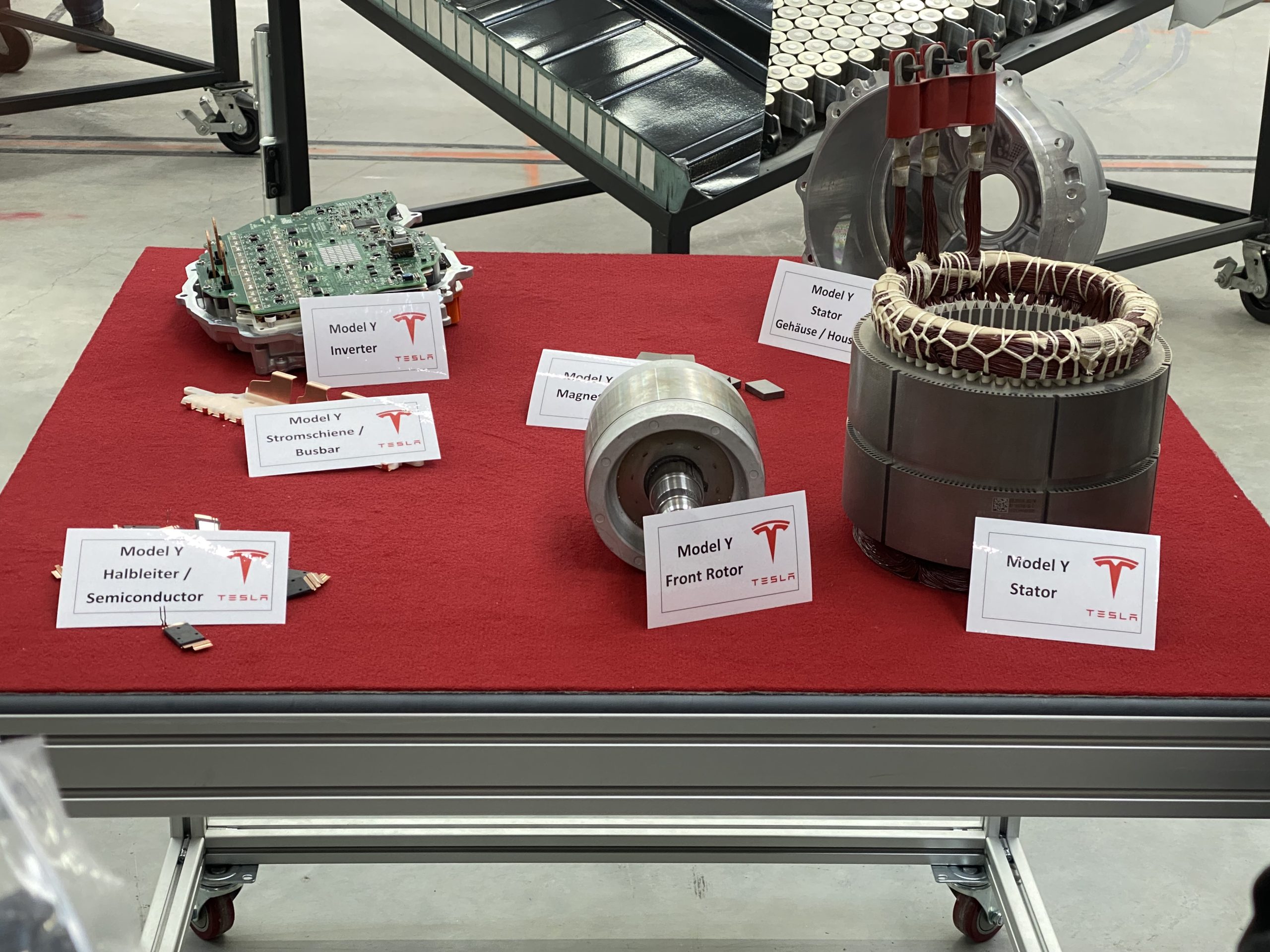 We kregen ook inzicht in allerlei componenten van de motor, zoals magneten, inverters, rotor en stator en zagen zelfs een mock-up van een deel van de carrosserie inclusief de 4680-cell. Met wat extrapolatie lijk ik hier uit te komen op 750 cellen (25 in de breedte, 35 in de lengte).
