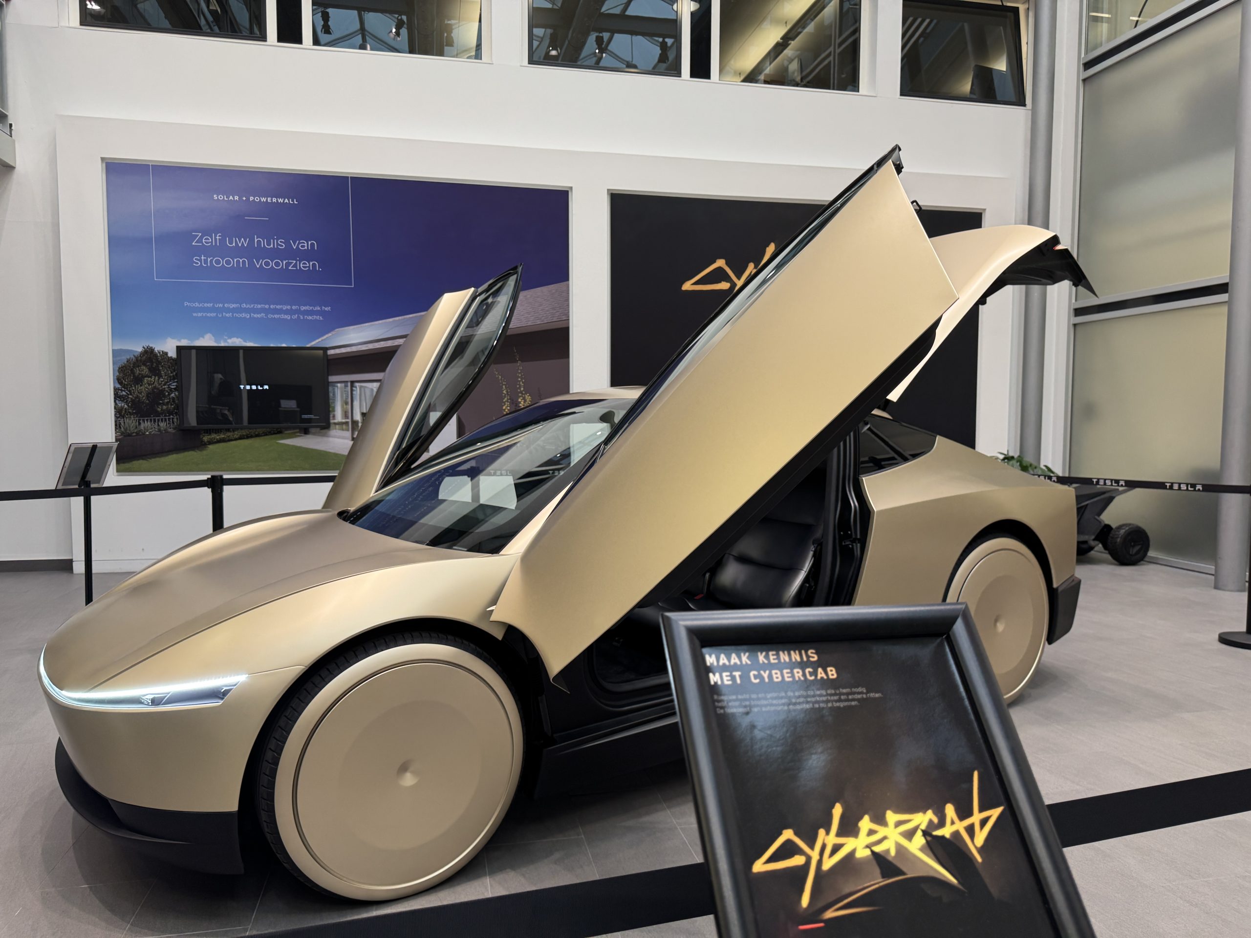 Zelf de CyberCab in het echt zien? Hij is nog tot 31/12 in Amsterdam. Als je een proefrit maakt met een Tesla (nog niet de CyberCab natuurlijk) of je eerder hebt aangemeld, dan kun je er even een rondje omheen lopen. De moeite waard!